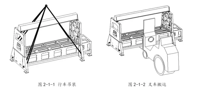 設備的運輸應符合相關的安全運輸規(guī)定,在吊裝時吊索只能在油箱底部及機腳上捆綁(按如圖2-1-1,2-1-2所示)。