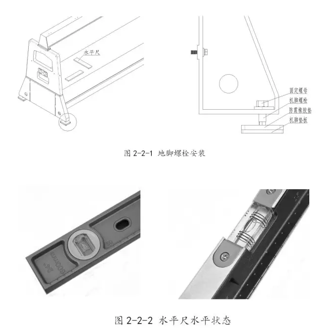 如圖2-3所示,安裝地腳螺栓、機腳墊板和防震橡膠墊,隨后將水平尺放置在油箱上表面,觀察氣泡位置,調節(jié)地腳螺栓,直至氣泡移至水平尺中心(如圖2-2-1, 2-2-2所示),需檢查機頭機尾均水平。
